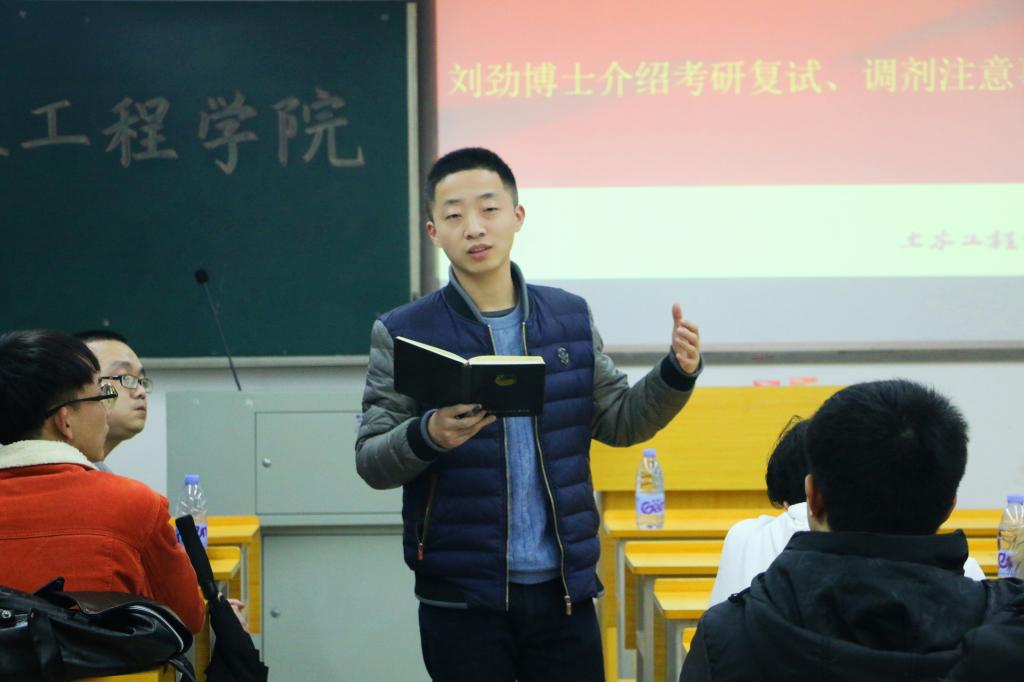 随后,刘劲向考研学子详细地介绍了考研复试、调剂的注意事项,通过刘劲对自己的考研经历的介绍,考研学子进一步明确了自己的报考目标。刘劲博士提出,在调剂的过程中考研学子应多与老师交流,积极向老师询问相关问题,老师也会对同学们的问题提出一些具有针对性的解决方案。大会上,刘劲博士还邀请了一位考研学子分享了自己的择校经历,并以此为例向参加考研复试的同学强调了切合自己的分数选择最合适的学校的重要性。