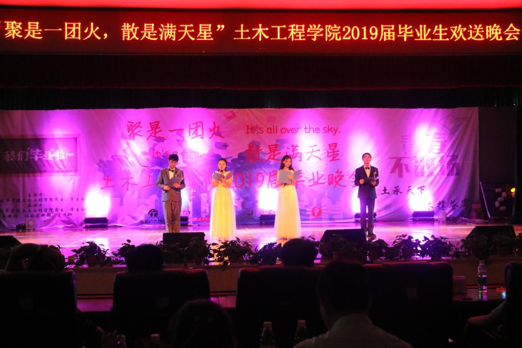 (土木院通讯员 黄湘粤) 6月5日19:30,17cg2019届“聚是一团火,散是满天星”毕业生欢送晚会于新食堂三楼学生活动中心正式拉开帷幕。本次毕业晚会由17cg团委、学生会主办。出席本次毕业晚会的嘉宾有湖南城市学院党委委员、纪委书记姚春梅,校党委学生工作部部长龙文,17cg院长曹国辉,17cg党委书记郭白泉,党委副书记贺望林、党委副书记王传浩,校团委指导老师王露,土木学院团委书记代敏,建筑与城市规划学院团委书记金倩,机械与电气工程学院团委书记段虹伶,17cg学工办主任许磊以及土木学院学工办全体老师,17cg全体大四毕业生参加了晚会。