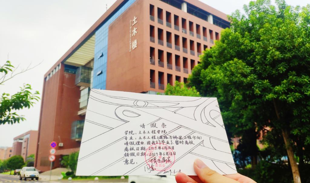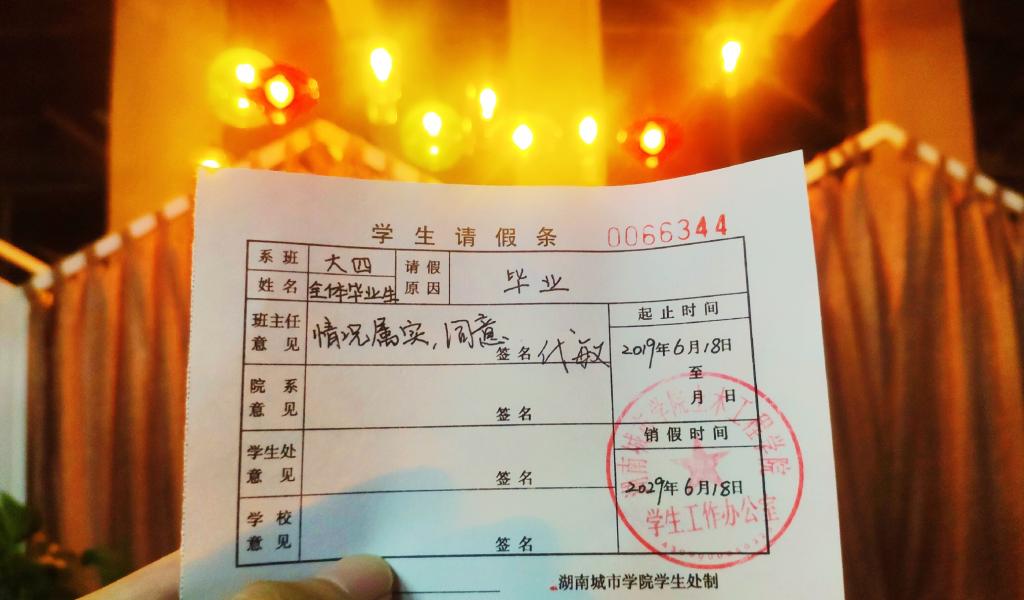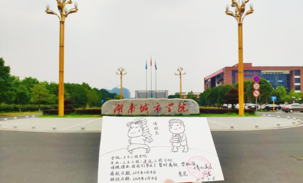 为了让湖南城市学院17cg19届毕业生留下自己独特的青春印记,湖南城市学院17cg团委、学生会为17cg每个专业制作了一批具有专业特色和校园情怀的请假条,请假条上写着请假的时间为十年,代表着毕业生们与母校的十年之约。