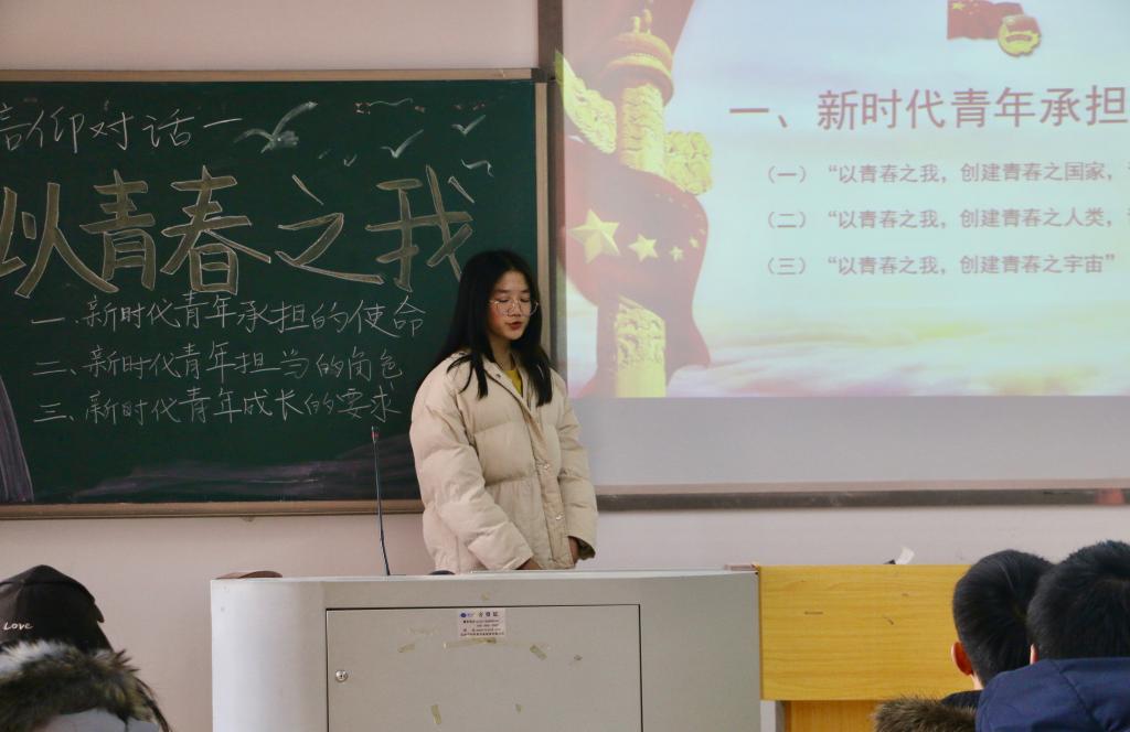 班会最后,卢文青上台作总结。卢文清结合自身实际情况向同学们讲述了他作为共青团员的成长故事,提出了新时代青年应有远大理想、坚定信念,应时刻牢记自己的时代使命。卢文清提出,希望全部同学一起努力一起进步,真正做到尽职尽责,成为一名优秀团员。至此,本次班会圆满结束。