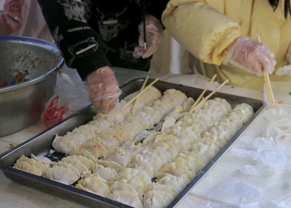 浓浓冬日情,暖暖饺子心。首先开展的是饺子制作组,在食材与器具准备就绪后,志愿者们先把皮平坦地放在手掌心上,用筷子把肉馅儿放在雪白的饺子皮中间。饺皮对边按在一起,再按起许多花边,花边编密了,像一把把梳子。白白胖胖的饺子,一个接一个地出现,个个憨态可掬,扁似月牙弯,鼓似元宝落玉盘。凛冽的冬风也不减分毫热情。制作完成后,青志干事们将饺子收集暂存以备第二天使用。暖暖的饺子有独属冬日的温情,给寒风中默默工作的人送去一丝温暖。隆冬有新饺,人间有温情,这个冬天不会冷。