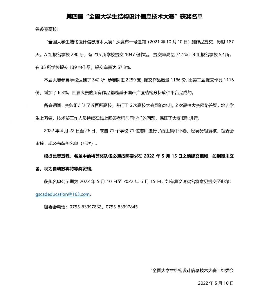 2022年5月10日,第四届全国大学生结构设计信息技术大赛圆满落幕。本次比赛主要为促进高等院校土木工程专业及相关专业人才培养模式的改革,推进高校BIM实践教学,提高学生的科技创新能力与实践技能,为各校大学生搭建同台竞技的舞台,是国内土木专业领域具有影响力的赛事之一。