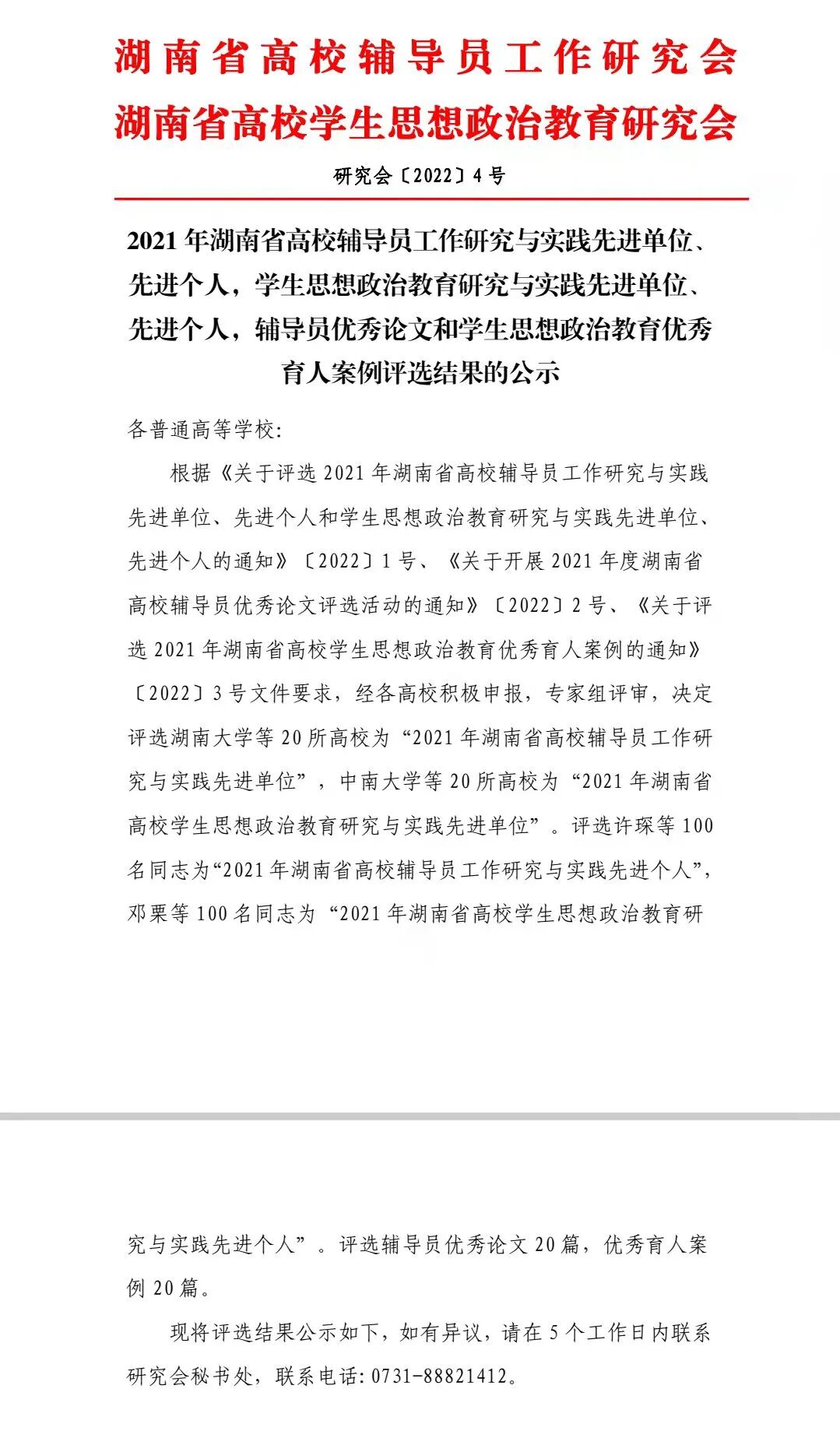 2022年5月9日,2021 年湖南省高校辅导员工作研究与实践先进单位、 先进个人,学生思想政治教育研究与实践先进单位、 先进个人,辅导员优秀论文和学生思想政治教育优秀育人案例评选结果公示。
