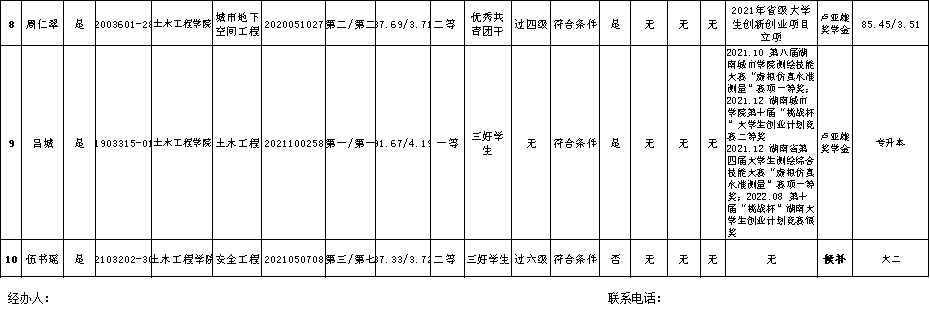 按照学校《关于做好2022年校友奖学金评审工作的通知》要求,经个人申请、辅导员评议,拟推荐1903903-31赵霏、2003309-07金文英、2003602-14谢东升、2003904-23李秋蓉、2003308-19杨刘杰等5名同学为曾壮丽奖学金获得人选,1903309-04邓雨舟、2003604-23肖彤、2003601-28周仁翠、1903315-01吕城等4名同学为卢亚雄奖学金获得人选,2103202-30伍书瑶为候补。