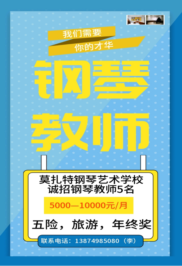 【岗位要求】钢琴教师要求599水平已上,有爱心,有耐心,热爱教学工作。