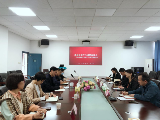 2021年10月26日上午,学校党委副书记何旭娟带队,党委委员组织部长吕贤军、组织部副部长孙智坤、组织部组织科长刘淑莉等一行4人,来我院调研基层党建工作并在土木楼722会议室召开专题调研座谈会。院党委书记郭白泉、副书记黄智、党委委员组织员徐丽苹、团委书记谢文静、工程造价系党支部书记罗燕玲等参加调研座谈。