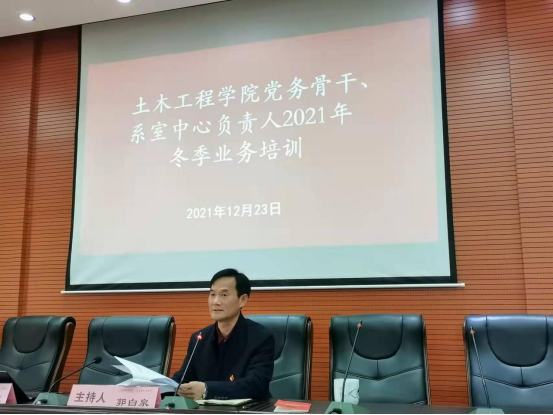 2021年12月23日下午,院党委在土木楼828大会议室举办2021年冬季干部业务能力培训。参加培训的成员有:全体院领导、系室中心负责人、党支部书记、党支部支委委员等。培训由学院党委书记郭白泉主持。