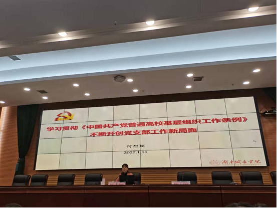 上午,学校党委书记李建奇主讲了学习党的十九届六中全会精神和湖南省第十二次党大会精神的主题辅导报告,学校党委副书记何旭娟作了学习贯彻《中国共产党普通高等学校基层组织工作条例》专题辅导报告,学校党委组织部副部长孙智坤对党支部工作实务进行了深入具体的解读。