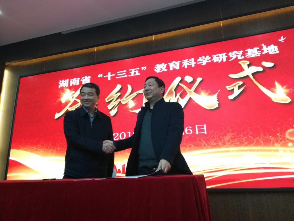 省教育科学研究院院长、省教育科学规划领导小组副组长兼规划办主任石灯明宣读了《关于确认湖南大学等15个单位为“湖南省‘十三五’教育科学研究基地”的通知》。省教育厅党组成员、省委教育工委副书记、省教育科学规划领导小组副组长王建华为15个研究基地首席专家授牌并与研究基地一一签订研究基地建设责任书。