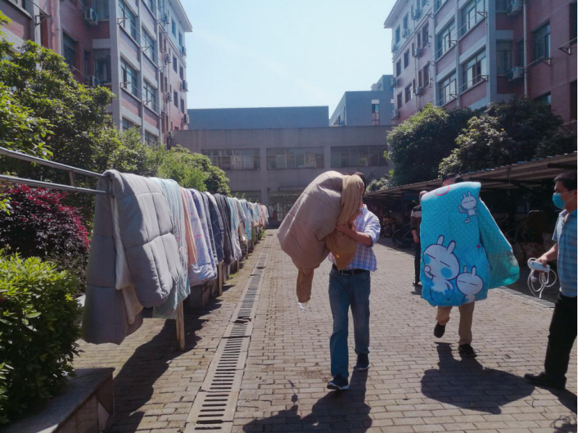 5月9日本科毕业生正式返校开学,归心似箭的学子们无不欢欣鼓舞,为了让学生返校倍感回家的亲切与温暖,2020年4月29日上午,作为湖南城市学院学生人数规模最大的二级学院—17cg,闻令而动,院学工办、团委组织发动全体院领导、辅导员、毕业班班主任和部分在校教师党员40余人,深入学生公寓开展“迎返校晒温暖”活动。趁着艳阳高照的大好天气,分组下到219间毕业生寝室,开窗通风晒被子,院党委书记郭白泉、副书记王传浩等带队到学生公寓11栋,和大家一道将33间一楼寝室所有盖、垫被子、枕套等全部搬到室外晾晒。郭白泉说“要像迎接自己的孩子回家一样,哪怕是为他们晒晒被子通通风,于无声处,让学生感受学校无微不至的关爱与温暖,我们今天为毕业生晒被子,毕业生回来后再去为肄业班同学晒被子,将爱心和温暖传递下去,不失为疫情防控情势下一堂鲜活的人文关爱与道德教育实践课”。