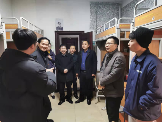 在23栋121宿舍,袁志成嘘寒问暖,与留校的3位学生进行了亲切交谈。他仔细查看了学生寝室床被衣物与生活日常用品,仔细询问他们寒假期间的学习、住宿、饮食、活动情况和家庭疫情状况,得知衣食无忧、留校生活充实而丰富多彩,感到由衷高兴。他嘱咐留校学生要提高防护意识,配合学校做好疫情防控工作,养成良好卫生习惯,积极开展健身运动,强健体魄,保持良好的身心状态,度过一个平安、祥和的假期和春节。袁志成语重心长地告诫学生,要科学合理安排假期学习生活,注重劳逸结合,按时作息,充分利用假期“加油充电”,为下学期专业学习打好基础。同时要多和家人联系沟通,遇到困难要及时向学校反映,学校会给予最大程度的支持与帮助,家校携手共克疫情。