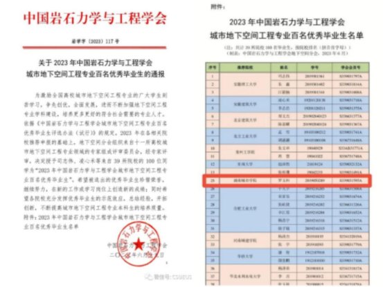 ★罗玉科同学荣获2023年“全国城市地下空间工程专业百名优秀毕业生”殊荣