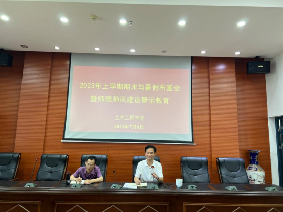2023年7月6日下午,学院在土木楼828报告厅组织召开全院教职工大会,开展师德师风专题教育。院党委书记郭白泉主持大会并讲话。