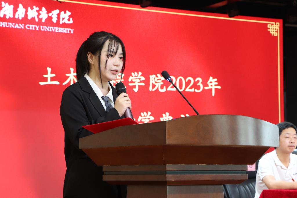 老生代表2103903班的颜思敏同学和全体新同学们分享了自己大学学习生活的经验体悟与成长阅历。她认为土木工程从来不仅仅只是一堆冰冷的数据,更是一门结合科学、艺术和人文的综合型学科。作为一名土木学子,要于日常学习中夯实基础、掌握精髓,要于亲身实践中提升自我、感悟真理。