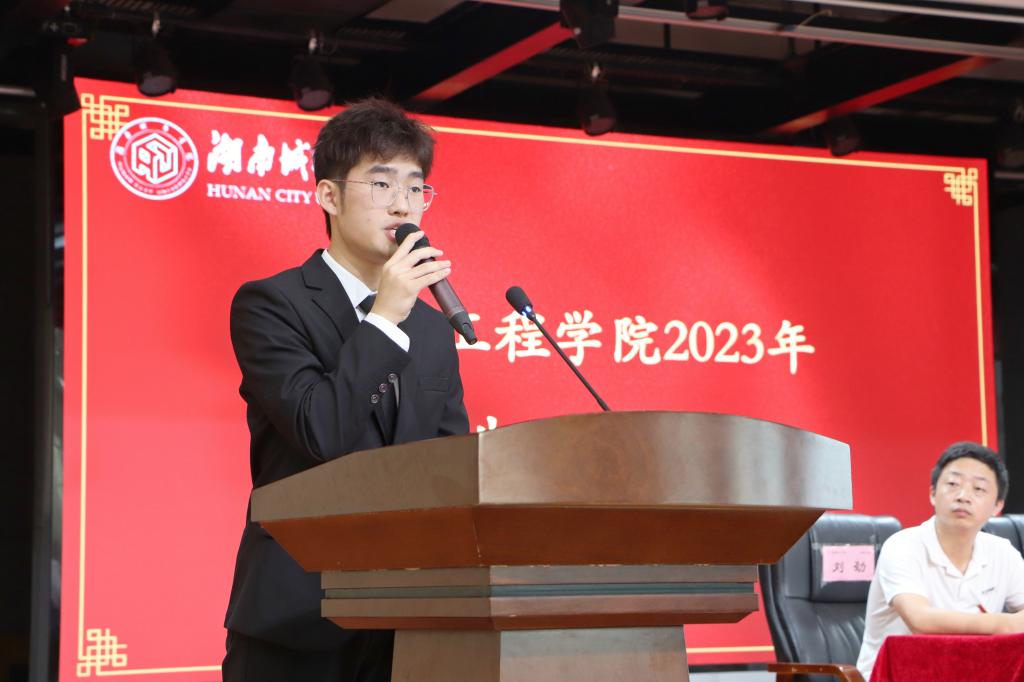 首先,2023级新生代表2303602的张南柯发言。他对未来4年大学生活充满憧憬,衷心期待与大家一道勤心同力、勉励奋进。青春奋斗时,吾辈当自强。面对即将开启的人生新征程,他呼吁新生一同秉持“品学兼修,知行统一”的校训和弘扬“土承天下,木撑苍穹”的院训精神,坚定理想、大步向前,奋力谱写青春奋斗华章。