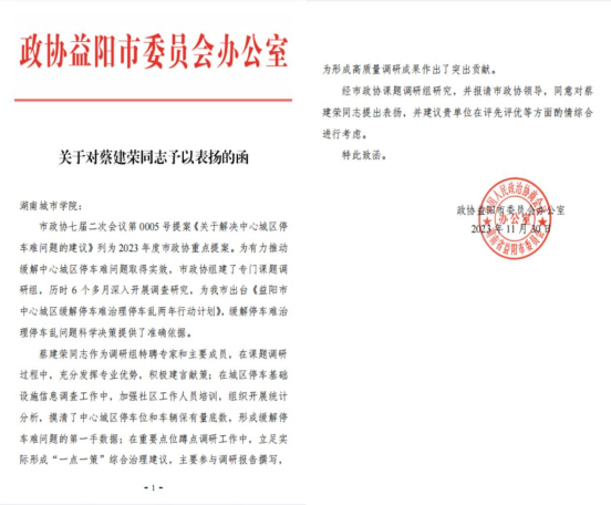 近日,从政协益阳市委员会传来消息,我院交通工程系主任蔡建荣同志作为2023年度市政协重点提案《关于解决中心城区停车难问题的建议》专题调研组特聘专家,在课题调研过程中,充分发挥专业优势,积极建言献策;在城区停车基础设施信息调查工作中,加强社区工作人员培训,组织开展统计分析,摸清了中心城区停车位和车辆保有量底数,形成缓解停车难问题的第一手数据;在重要点位蹲点调研工作中,立足实际形成“一点一策”综合治理建议,主要参与调研报告撰写,为形成高质量调研成果作出了突出贡献。得到了政协益阳市委员会的书面表扬。