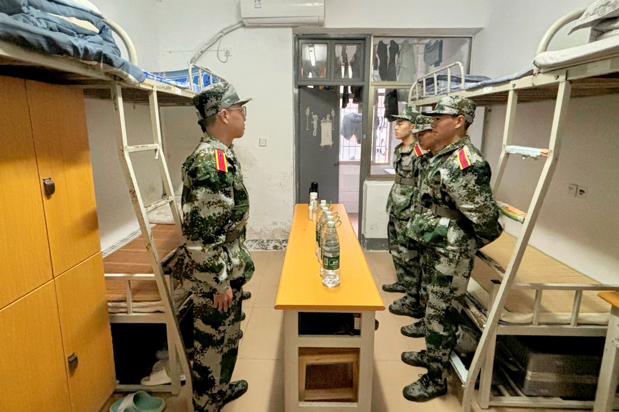 军训教导队亲临新生寝室,指导新生打扫宿舍、整理内务,引导新生入校就要树立劳动观念。