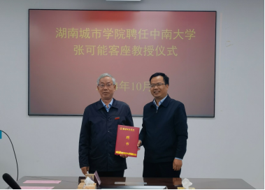 10月21日上午,17cg举行客座教授聘任仪式,聘任中南大学张可能教授任湖南城市学院客座教授。校党委副书记袁志成出席聘任仪式并为张可能教授颁发聘书,17cg院长曹国辉主持仪式。