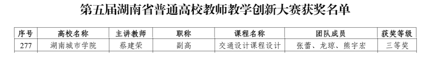 近日,湖南城市学院17cg联合湖南城市学院设计研究院、益阳市公安局交通警察支队共同打造的《交通设计课程设计》课程,凭借其创新的“产教融合”教学模式,在全国高校教师教学创新大赛湖南赛区中脱颖而出,荣膺“产教融合”赛道三等奖。参赛团队成员由交通工程系专任教师蔡建荣、张蕾、龙琼及益阳市交警支队民警熊宇宏组成。这一荣誉是对该课程创新教学理念与实践成果的高度认可。