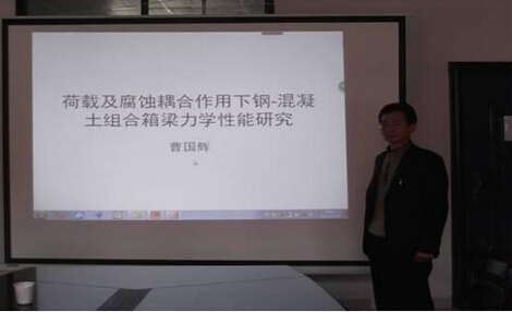 曹院长首先说明了提出该问题研究以及形成该课题研究的必要性,让大家都理解到这一课题的重要性。随后分析了国内外研究现状与发展动态,向其他老师展示了钢-混凝土组合梁耐久性研究的发展趋势。接着他表述了项目的研究内容、研究目标,并且制定了实验方案,分析了该课题的创新之处。