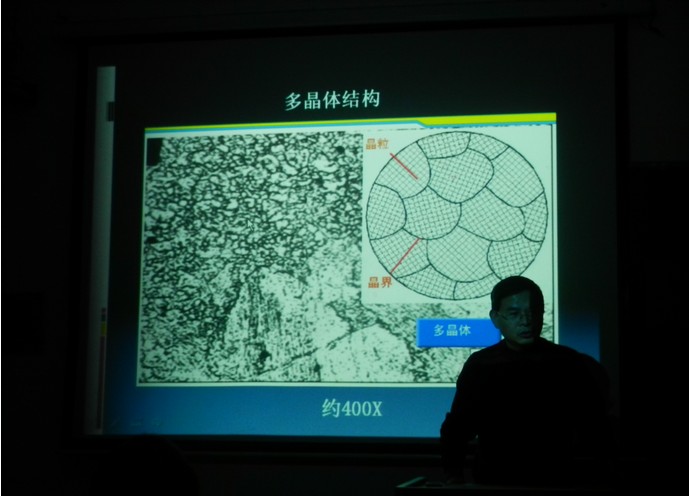 紧接着,李文斌博士向我们简单介绍了现代社会金属材料的发展现状,并从常用金属的强度和力学性能讲解不同金属应用于不同领域的原因。随后,他根据新闻的热点提出了美国海军新一代核动力航空母舰福特号,向我们展示了航空母舰上巨大的螺旋桨和轴承,并由螺旋桨和轴承的先进性将我们视线引入到金属的微观方面。从常见金属物体内部晶体结构开始介绍,让我们领略了七大晶系的风采,其幽默风趣的演说风格不时博得同学们的热烈掌声。