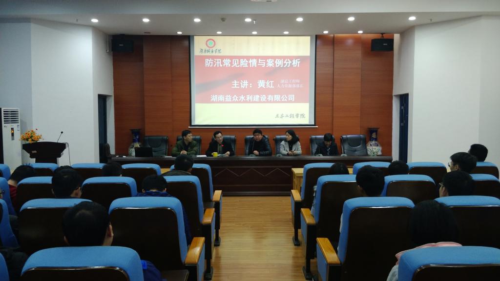 首先,在黎永索副院长逐一介绍完出席讲座的嘉宾后,曹国辉院长发表总起性的讲话,介绍了17cg中的水利水电工程专业并表达了对水利水电工程专业学生的深厚期望。然后,黄红女士发表了以“防汛常见险情与案例分析”为主题的演讲,让同学们了解了防汛和自己所学专业的重要意义。接着,徐琼华女士发表了以“尽快适应从大学生到专业技术人员的角色转换 ”为主题的演讲,并鼓励同学们端正态度,努力学习。张开先生还着重介绍了湖南益众水利建设有限公司以及表达了对我们学校优秀人才的渴望。