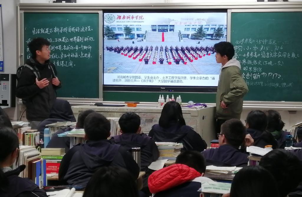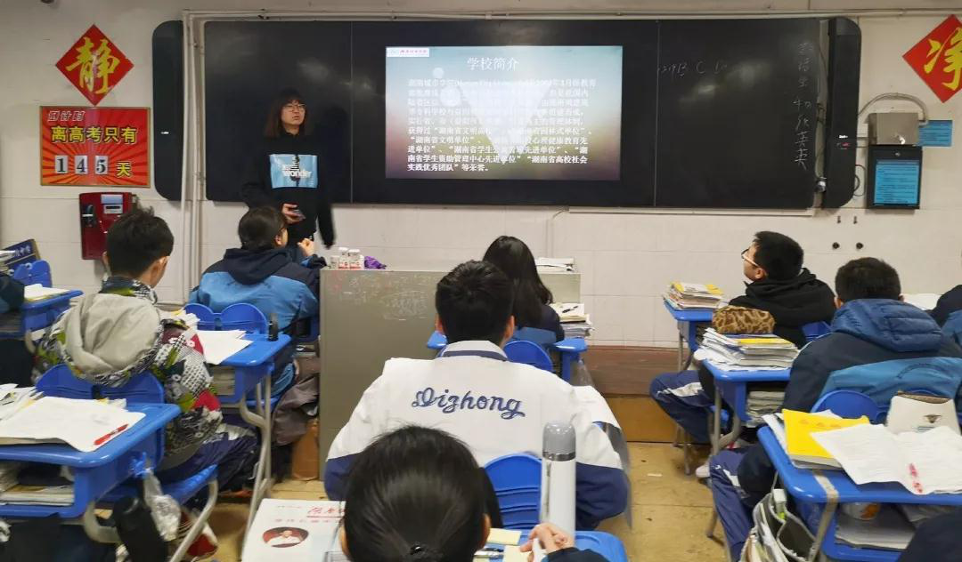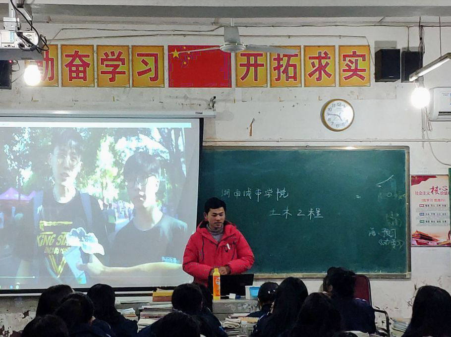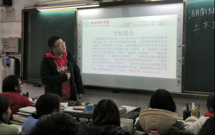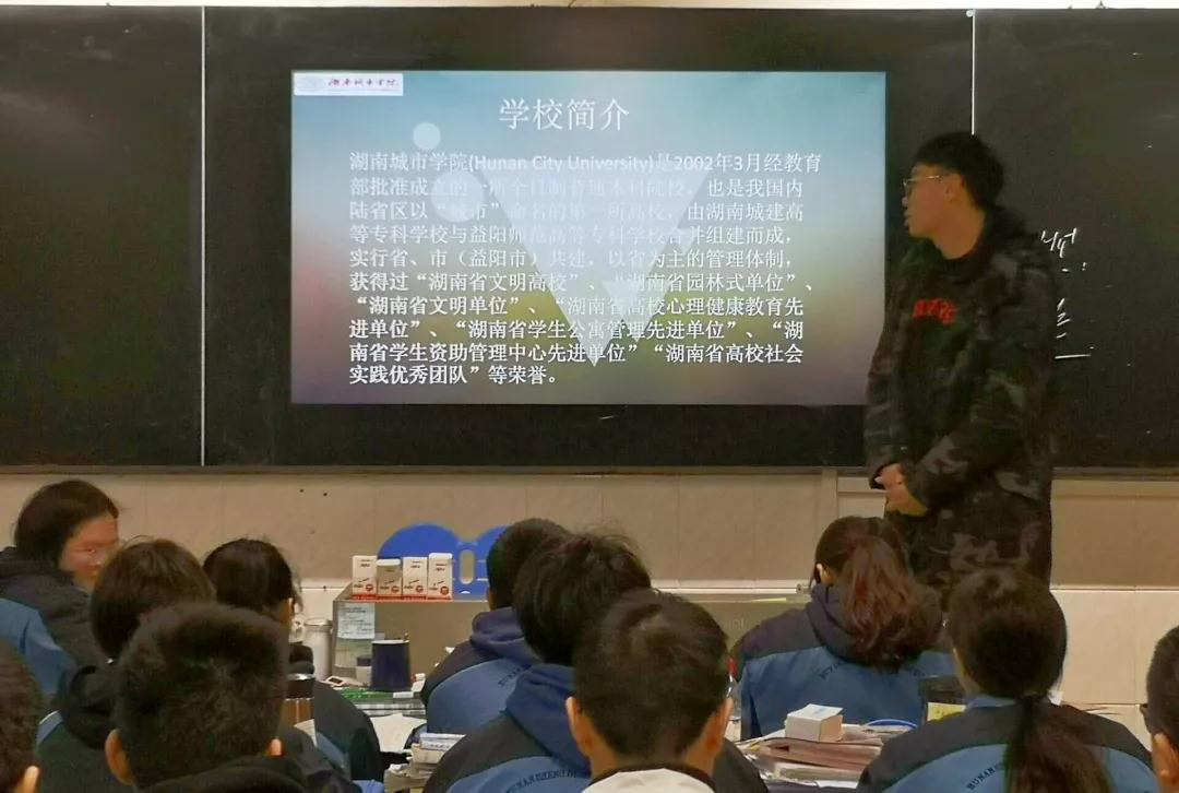 七个团队的小组成员们通过摆台、下班宣传等形式,向各学校的各班同学分发湖南城市学院宣传手册、宣传报刊以及招生资料。为了让高三学子更简单直观地了解湖南城市学院,积极报考湖南城市学院,小组成员走进课堂,通过播放宣传视频、演示PPT、讲解宣传手册和宣传报刊的方式,向即将择校的高三学子全方面地介绍了湖南城市学院的综合实力、教学资源、校舍环境、教学特色以及育人水平等,并重点强调了学校各专业建设情况及其就业情况、近年来我校在学风建设、学术科研等方面取得的成就以及我校部分知名校友,让同学们对湖南城市学院有了更深入的了解。同时,各小组成员也对2019年湖南城市学院专业培养目标和招生指标等相关方面进行了仔细的介绍。对于同学们普遍关注的问题,各小组成员们耐心细心地为其讲解,解决他们的疑惑。宝剑锋从磨砺出,梅花香自苦寒来。各小组成员鼓励即将参加高考的莘莘学子,继续努力,为更好的未来而拼搏。