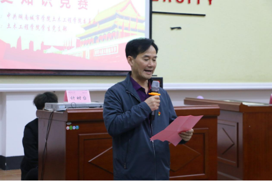 决赛前,17cg党委书记郭白泉发表了热情洋溢的讲话,他指出,党史是最好的教科书,党史是最好的营养剂。我们要通过这样生动活泼的活动载体,促推全院师生特别是广大党员和积极分子深入学习党的百年奋斗史、党的矢志为民史、党的理论创新史、党的精神锻造史和党的自我革新史,真正做到学史明理、学史增信、学史崇德、学史力行,在党史中汲取营养与力量,化为为党育人、为国育才的政治自觉与责任担当,化为勤学苦练、报效祖国的家国情怀与实际行动,化为推进学校学院“十四五”事业高质量发展的磅礴伟力!