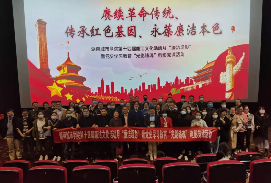 根据学校党委、纪委关于推进“师德师风建设年”活动和《关于开展第十四届廉洁文化活动月的通知》精神,推进党史学习教育走实走深,持续加强对广大教师的革命传统教育、先进典型教育。同时为切实加强党风廉政建设与清廉校园建设,开展廉洁文化活动月“廉洁观影”暨党史学习教育“光影铸魂”电影党课活动,2021年10月26日晚,院党委、分工会组织全院教职工党员和工会会员,在益阳万达影城集体观看《长津湖》《我和我的父辈》。