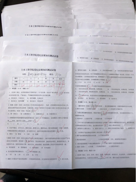 专题党课之后,组织全体参会的教职工党员进行了党纪法规知识专题考试。对于请假缺席人员,各党支部在规定时间内组织进行了补考,确保了党员应考尽考全覆盖,参考率100%。近期院党委组织专人集中评阅了试卷。统分结果显示,参加考试的84名教职工党员,平均得分90.1分,其中最高分98分,最低分80分。各党支部党员平均得分依次为:道路与交通工程系党支部92.8分;建工系综合办联合党支部90.2分;力学教研室党支部90.2分;地下空间系党支部90.1分;工程造价系党支部88.8分;实验中心党支部88.3分。